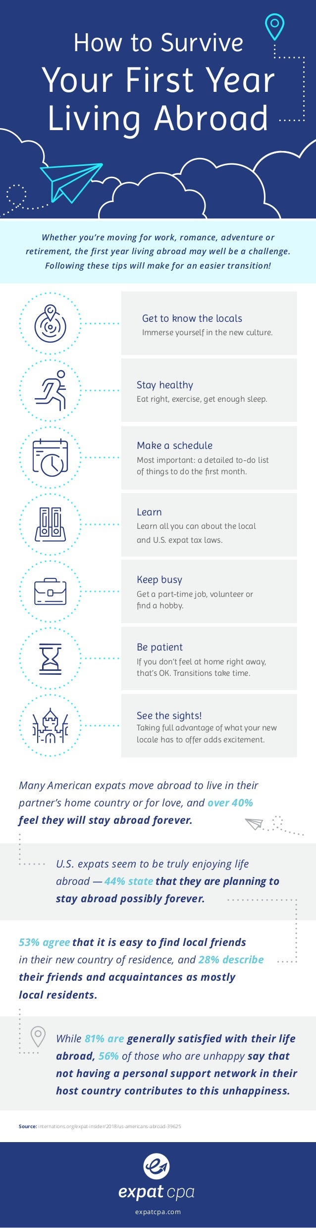 The infographic provided, titled “How To Survive Your First Year Living Abroad,” serves as a valuable resource for those contemplating a move outside the U.S. or individuals already residing abroad, grappling with the challenges of acclimating to a new environment. In essence, the infographic emphasizes the pivotal importance of staying engaged and well-informed in order to thrive in a foreign setting. Increased interaction with locals, immersion in the local culture, and proactive exploration contribute to making the unfamiliar surroundings feel more familiar. While experiential learning is crucial, acquiring knowledge on tax obligations and financial matters proves equally valuable, addressing financial concerns ranging from wealth management to daily budgeting.